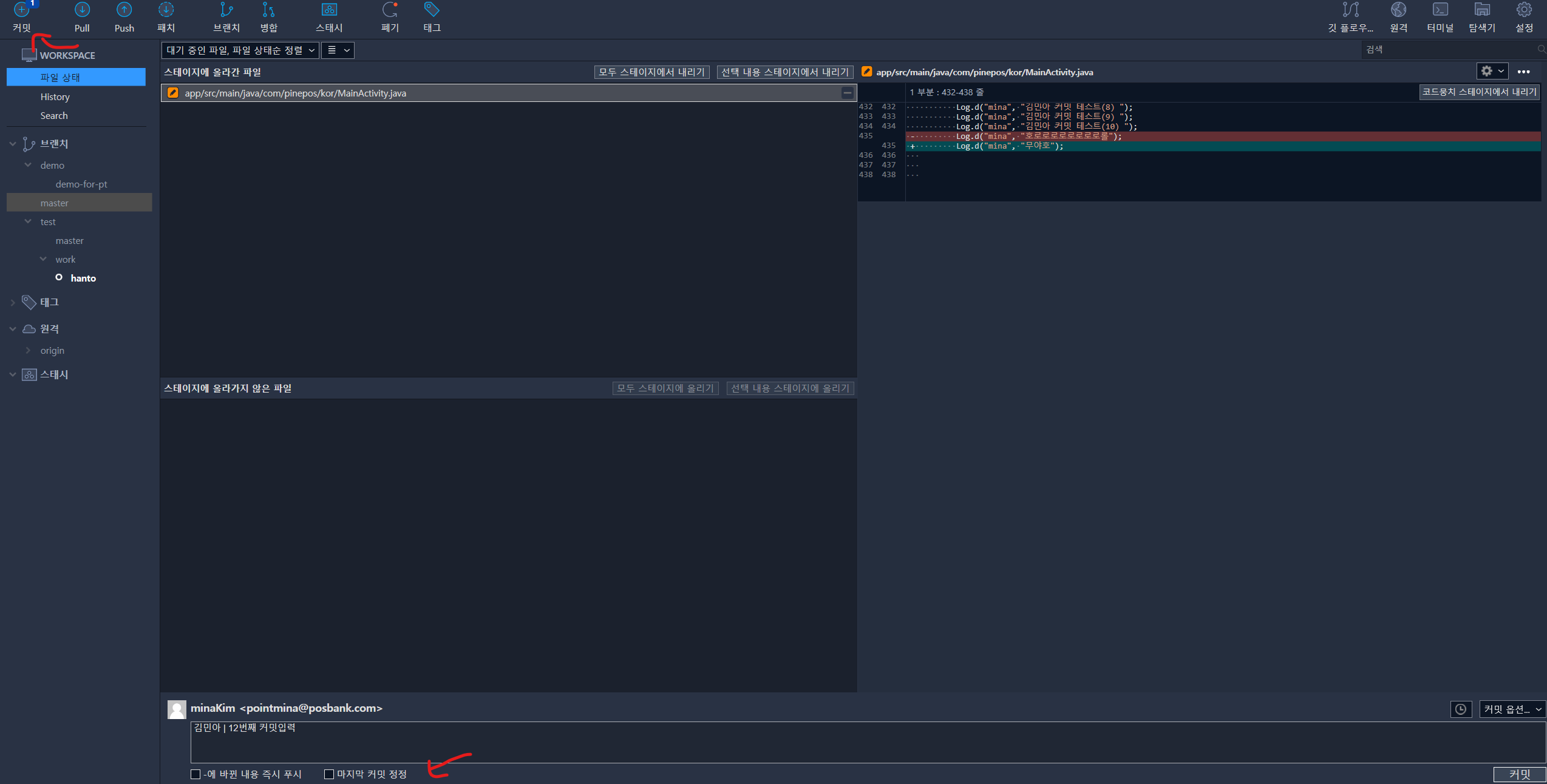 3. 변경 사항 스테이징 하여 올리고 커밋하기. 비슷한 내용으로 커밋할 게 여러개이면 마지막 커밋 정정 선택 후 커밋하기.