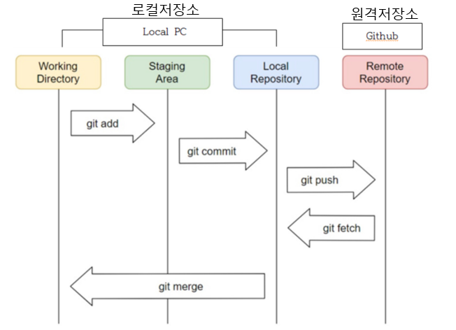- 푸쉬(push) : 로컬 저장소의 변경 사항을 원격 저장소에 업로드하는 작업